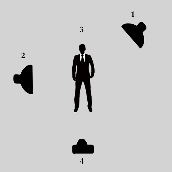 其次应用较多的是双灯立体光布光,分为如下几个类型:1.主光+辅光:光比相对较大,人物立体感比较强;2.主光+逆光:就是用两盏灯中的其中一盏做正面主光,表现被摄者的面部形神,而用另一盏灯在被摄者的后面对着相机作轮廓光表现被摄者的轮廓形态;3.主光+修饰光。